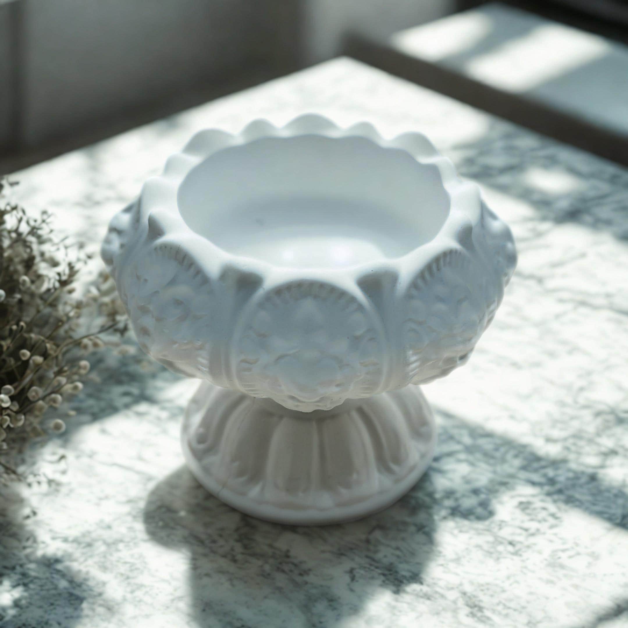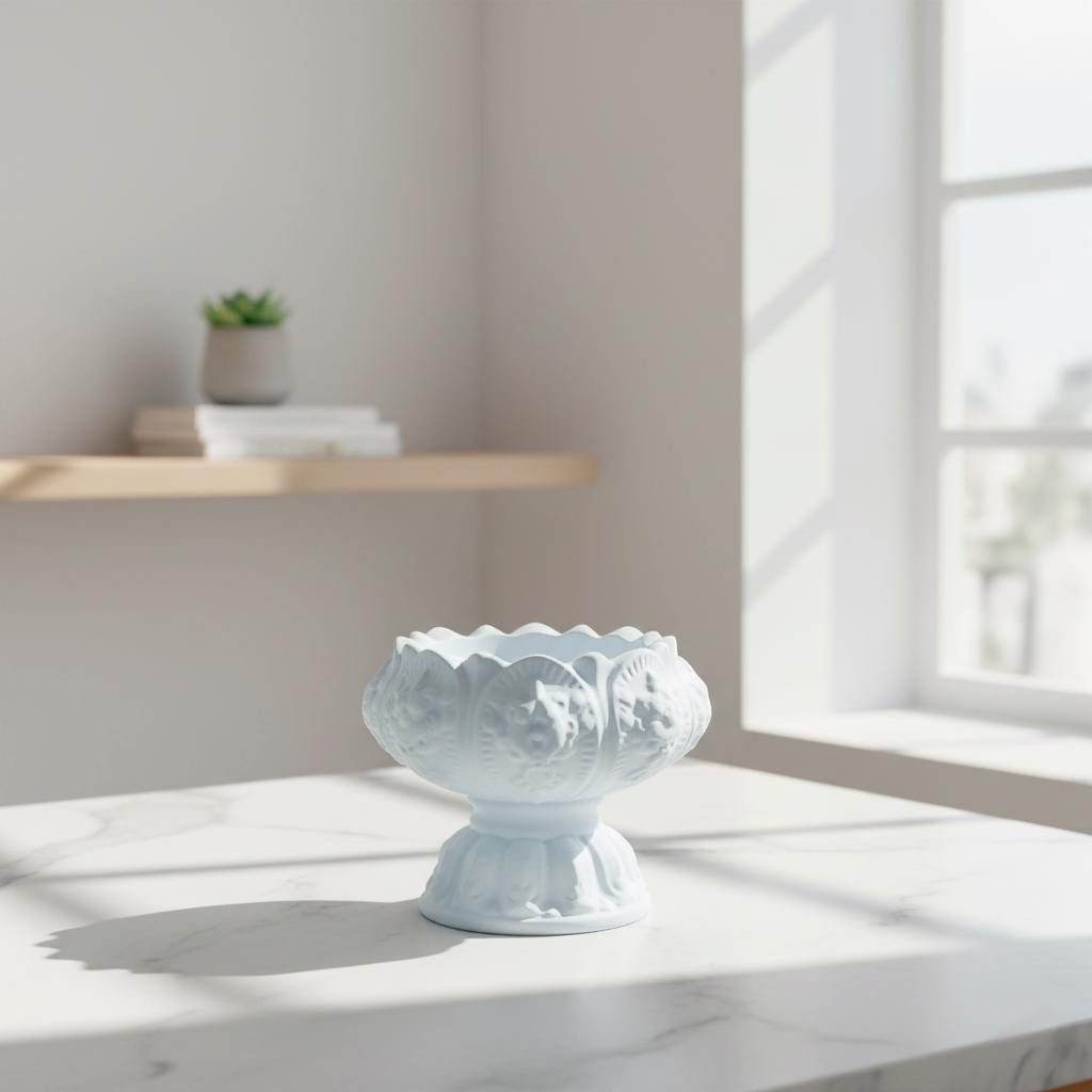 • Intricate Classical Design: Features deeply sculpted floral/foliage and classical motifs with a graceful scalloped rim and fluted pedestal base.