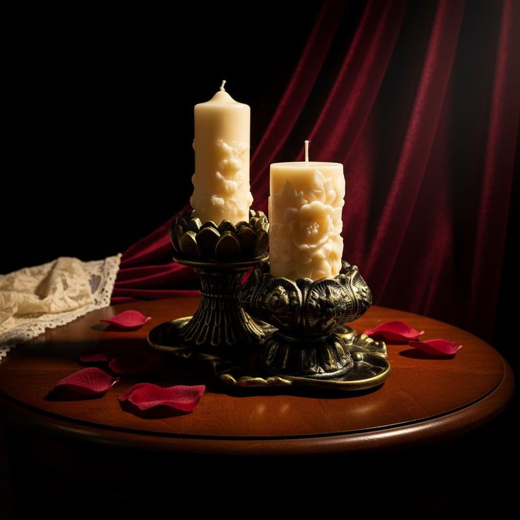 o Artistically Embossed Candles: Features two meticulously crafted ivory pillar candles with intricate and elegant floral designs.