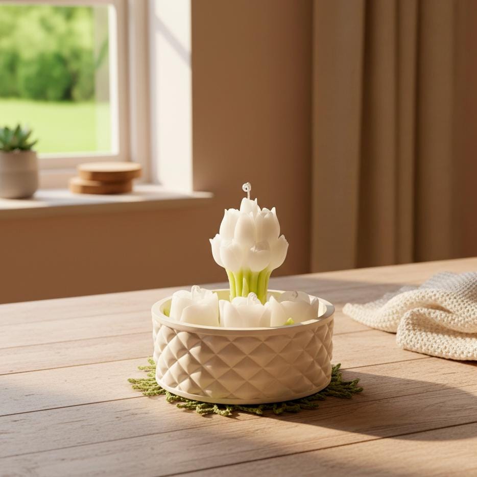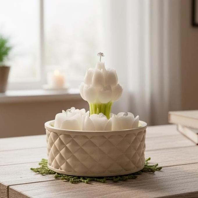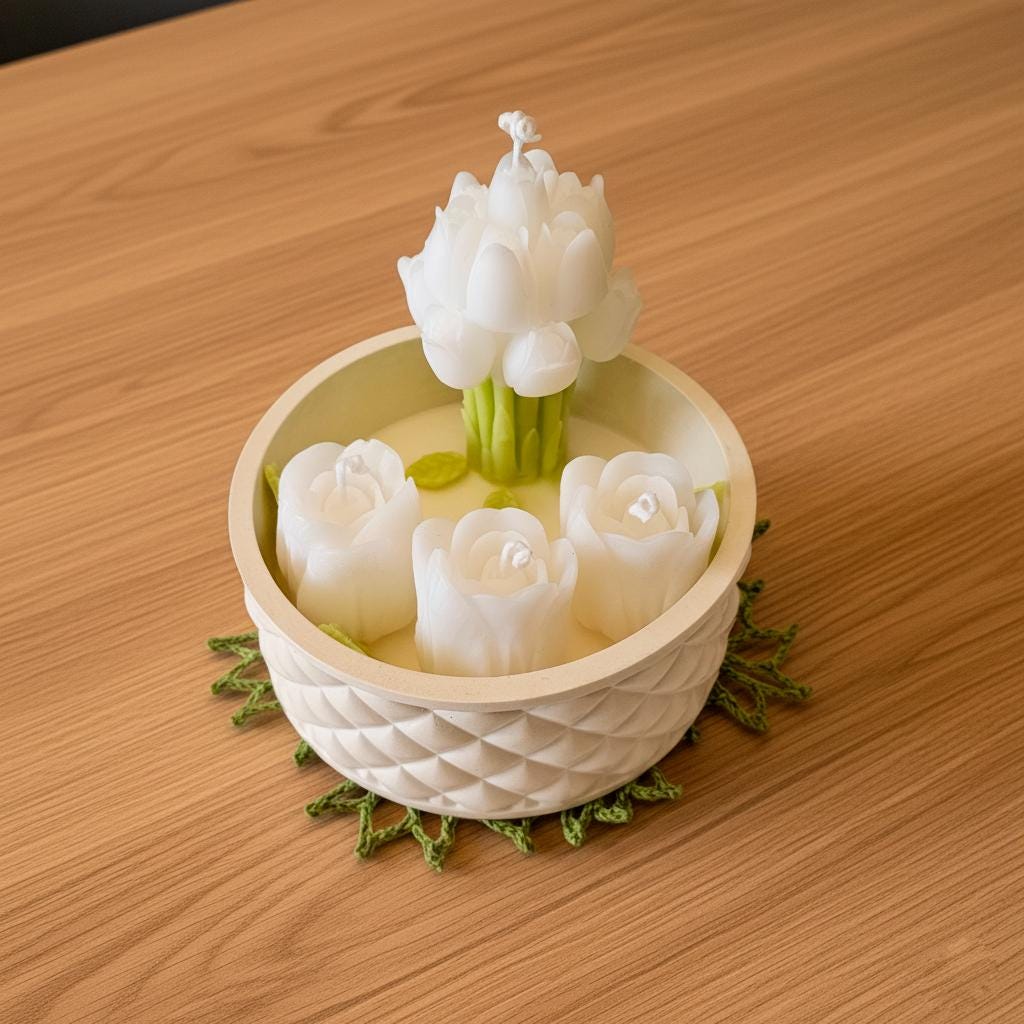 ✨Elevate your living space with the timeless elegance of this exquisite white floral arrangement candle. This captivating piece features a grand, intricately sculpted white lotus or peony-like candle standing tall, surrounded by three charming smaller white rose-shaped candles, all accented with delicate green leaves. The entire botanical display is beautifully nestled within a textured, quilted pattern round dish in a soft beige or off-white hue, creating a harmonious and sophisticated ensemble. More than just a candle, it's a handcrafted work of art designed to bring serene beauty and a touch of refined luxury to any room. It serves as an instant focal point, creating a peaceful, inviting, and wonderfully stylish atmosphere.