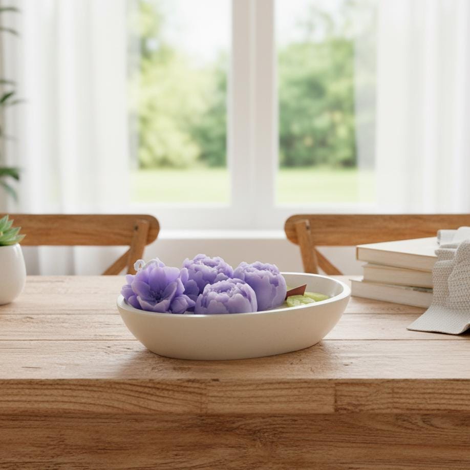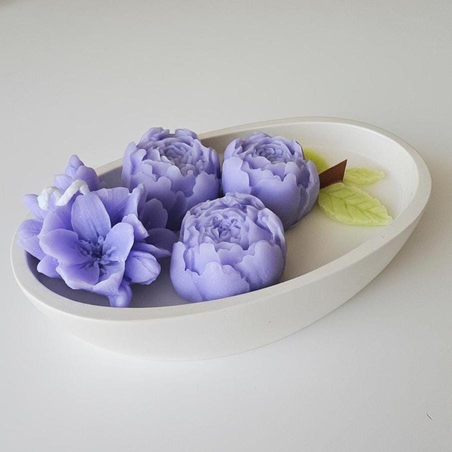 ✨Immerse your space in the tranquil beauty of a twilight garden with this enchanting lavender bloom candle. This unique floral arrangement features a harmonious collection of meticulously sculpted flowers in captivating shades of lavender and deep purple, accompanied by delicate light green leaves and a rustic wooden wick, all gracefully arranged within a sleek white oval dish. More than just a candle, it's a handcrafted masterpiece designed to infuse any room with a sense of calm elegance and visual delight. This piece is a true artistic statement, perfect for creating a soothing and inviting ambiance.