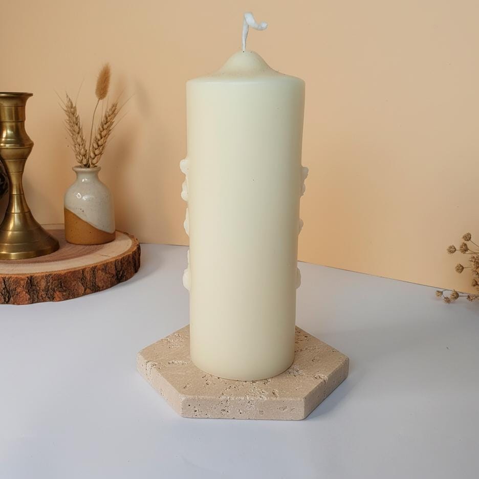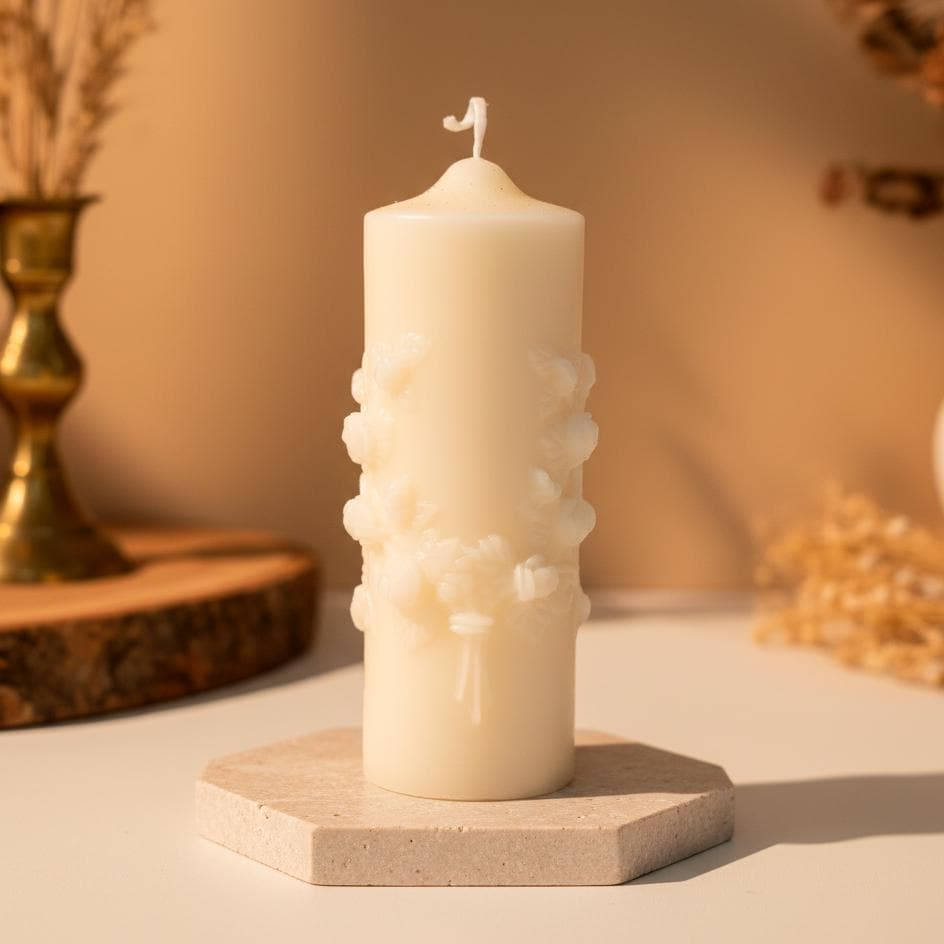 ✨Discover the timeless charm of our Elegant Floral Embossed Pillar Candle! This exquisite candle features a delicate, intricate floral design that wraps around its creamy white surface, adding a touch of sophisticated beauty to any setting. It's more than just a source of light; it's a handcrafted piece of art designed to enhance your home's decor with its subtle texture and classic appeal.