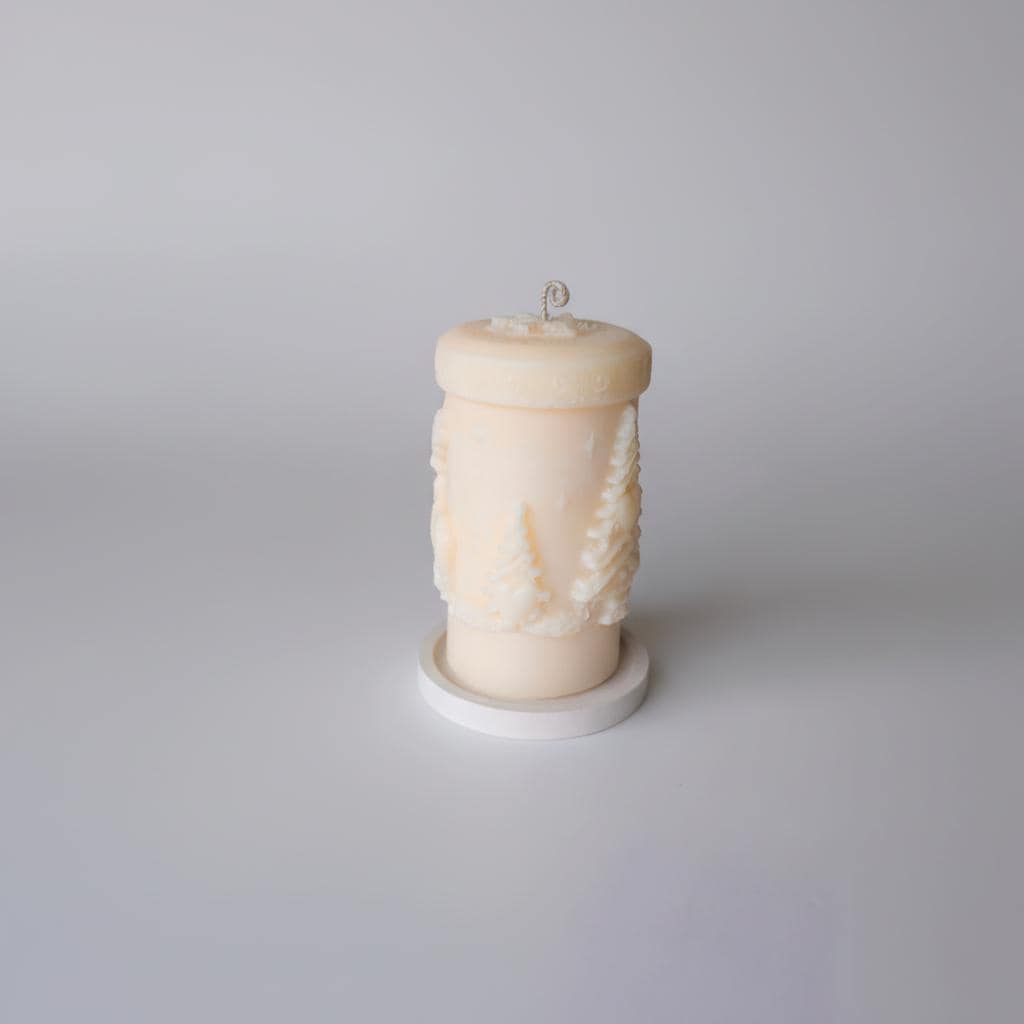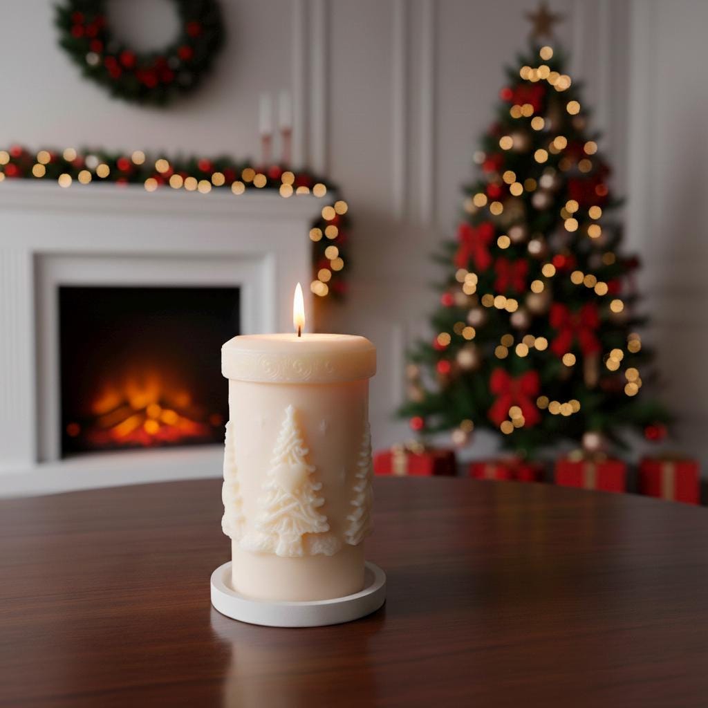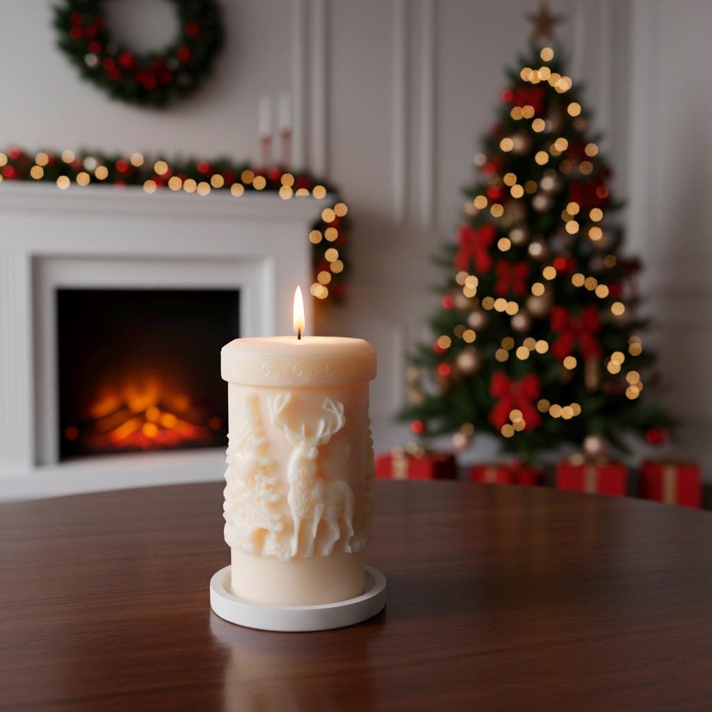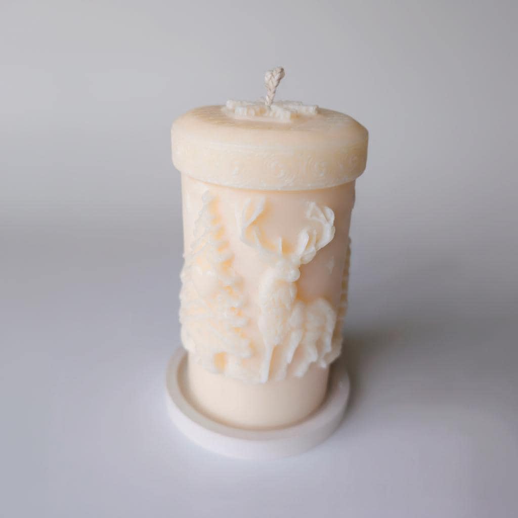 Bring the serene magic of a moonlit winter forest into your home with this enchanting, intricately carved pillar candle. This exquisite piece features a beautifully sculpted design that captures the peaceful spirit of the season: a majestic stag with impressive antlers stands gracefully amidst a backdrop of stylized evergreen trees, evoking a tranquil snowy woodland scene. A delicate coiled wick adds a touch of whimsical elegance to its top. Presented in a warm, inviting cream or ivory hue, this candle is more than just a source of light; it's a handcrafted work of art designed to infuse your home with warmth, natural beauty, and a touch of nostalgic charm. It creates an instant festive focal point, perfect for holiday gatherings or quiet evenings by the fire.